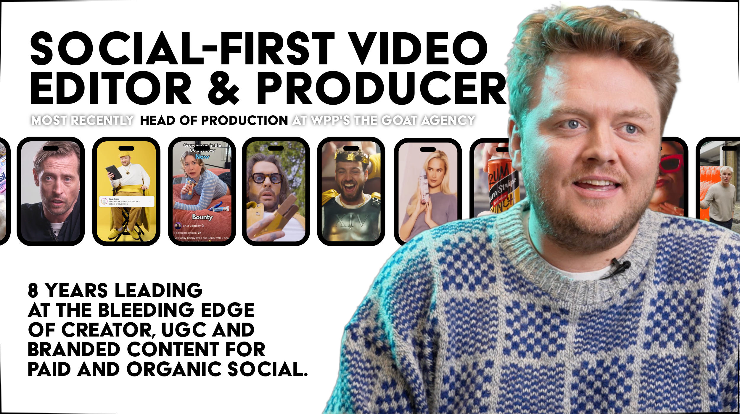 I was writer, director and post-production lead on Mars’ “Pete Twix” campaign, a tongue-in-cheek social launch fronted by Pete Wicks. Built for TikTok and Meta platforms, the idea played on his reality-TV persona to give Twix a more personality-driven voice. I wrote the scripts, directed Pete on set and then led the edit, delivering a suite of vertical cutdowns and hook variations for both paid and organic placements.